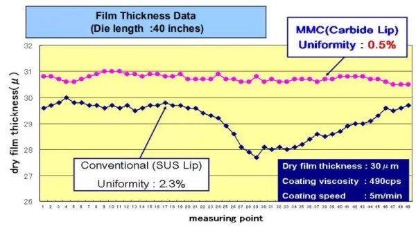 ?。?)刃口材料硬度高,耐磨損,使用壽命長(zhǎng)。正負(fù)極漿料是由固體顆粒組成的懸浮液,在涂布過(guò)程中漿料在壓力作用下不斷從刃口狹縫噴出,固體顆粒會(huì)對(duì)刃口噴出面形成磨粒磨損,這就要求刃口材料硬度高,耐磨,能夠長(zhǎng)期使用。
